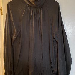 Ett par mörkgrå byxor med fickor fram och bak. Byxorna har en knapp och en dragkedja framtill. De har en avslappnad passform och är bekväma att bära.