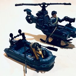 Svarta tuffa byxor med mudd i midjan och benslut. Dekorativ dragkedja på ena benet och förstärkning på knäna. En liten etikett med en mask på sidan.