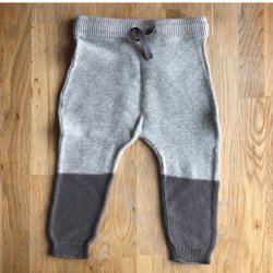 Ett par grå babybyxor med muddar och dragsko i midjan.