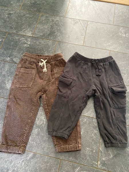 Ett par bruna manchesterbyxor och ett par mörkgrå byxor med fickor på benen. Båda byxorna har resår och dragsko i midjan. Perfekta i höst vinter till förskolan!