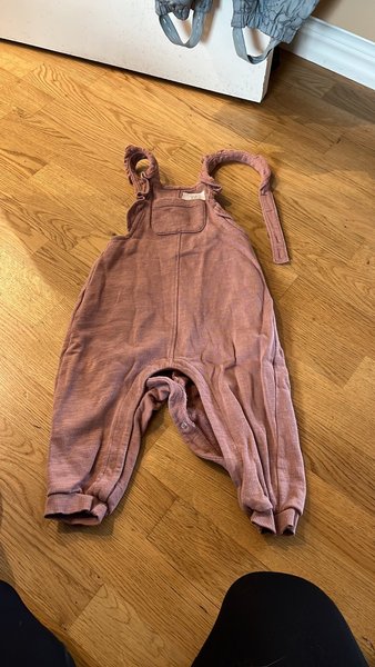 Rosa hängselbyxor med justerbara axelband och en liten ficka framtill.