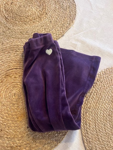 Ett par lila byxor med utsvängda ben i velour. Byxorna har en resår i midjan och en liten silverfärgad hjärtapplikation. Ifrån Lindex storlek 104