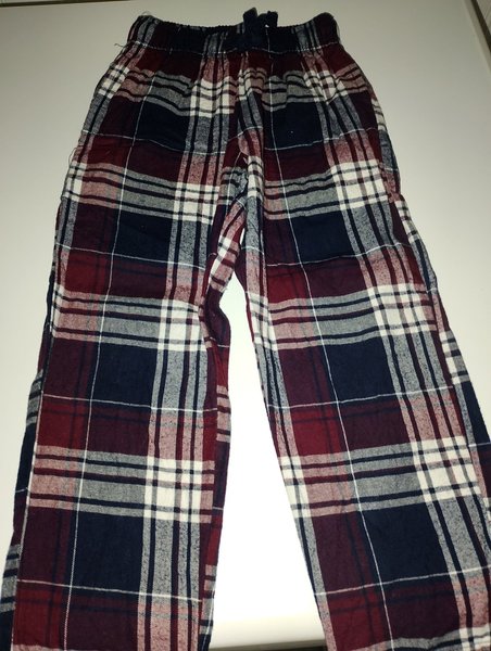 Rutiga byxor med resår och knytband i midjan. Byxorna har ett klassiskt rutmönster i färgerna rött, mörkblått och vitt.