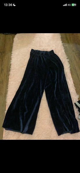 Ett par mörkblå plisserade byxor med resår i midjan. Byxorna har vida ben.