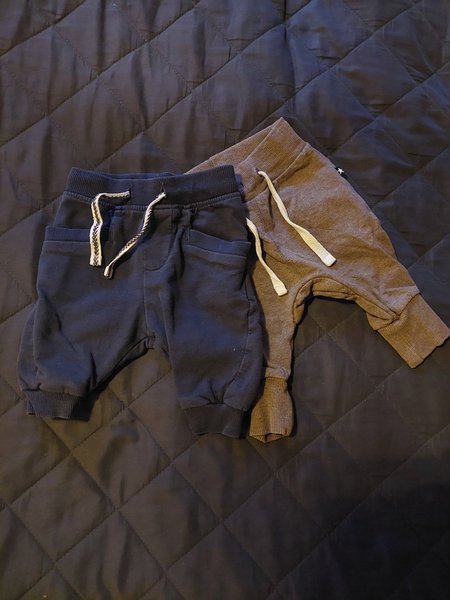 Ett par bekväma byxor i två olika färger. Byxorna har resår i midjan och muddar nedtill.