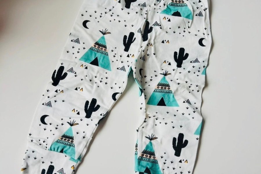 Byxor med resår i midjan och muddar vid bensluten. Mönstrade med svarta kaktusar, turkosa tält och små svarta halvmånar samt geometriska former på vit botten.