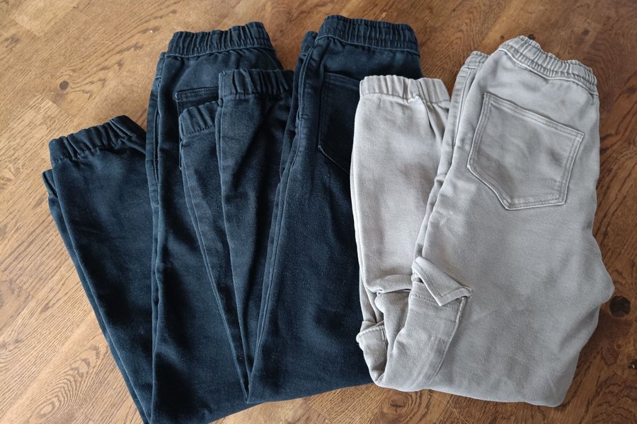 Tre par byxor. Två par är svarta och ett par är gråfärgade. Alla byxor har resår i midjan och muddar vid bensluten. De svarta byxorna har fickor fram och bak, medan de gråfärgade byxorna har fickor fram och bak samt en extra ficka på sidan av benet.