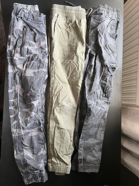 Tre par byxor. Ett par kamouflagemönstrade byxor med dragkedja på ena benet och resår i midja och benslut. Ett par gröna byxor med resår i midja och benslut. Ett par kamouflagemönstrade byxor med fickor på sidorna och resår i midja och benslut.