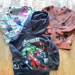 Ett paket med tre tröjor för barn. En randig tröja och ficka fram, en orange tröja med tryck av ett tigeransikte och en randig tröja med texten NYC.