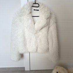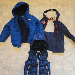 Detta är ett paket med tre ytterkläder för barn. Paketet innehåller en lång beige pufferjacka med huva, en rosa och brun teddyjacka från Lindex och en rosa väst från Reserved.