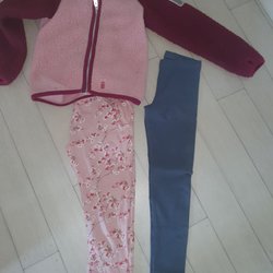 Ett set med en rosa blommig jacka och tre par byxor. Ett par svarta byxor med dragkedja, ett par svarta byxor med vit rand och ett par grå byxor.