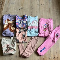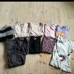 Ett set med barnkläder i olika färger och mönster. Inkluderar tröjor, byxor och en kofta. Kläderna har olika texturer, som ribbstickat och spets.