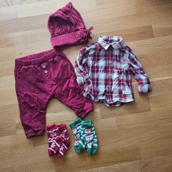 Ett set med pyjamasar. Inkluderar tre pyjamasar med julmotiv: pepparkakor, snögubbar och julhus. Dessutom ingår en röd dregglis, ett par röda strumpor och en vit dregglis med jultema.