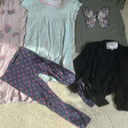 Fint klädpaket I storlek 116. Inkluderar en klänning med blommigt tryck (Lindex), två långärmade tröjor med vändbara paljetter (POMPdeLUX), en randig skjorta med ficka (ebbe), en långärmad tröja med blommigt tryck (Polarn och Pyret) och ett par leggings med prickigt mönster (H&M).