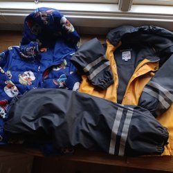 Detta är ett klädpaket med olika sommarkläder för barn. Paketet innehåller t-shirts med tryck och enfärgade shorts i olika färger som röd, grön, blå och grå.