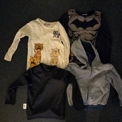 Detta är ett klädpaket med blandade barnkläder. Paketet innehåller långärmade tröjor med tryck, t-shirts med olika motiv som dinosaurier och serietryck, samt ett antal byxor i olika färger som blått, grönt, svart och orange. Kläderna verkar vara i olika stilar och design. Storlek 98 pojke.