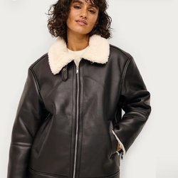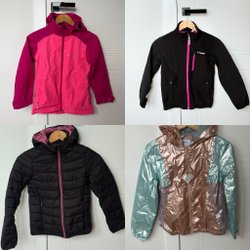 Detta är ett paket med tre ytterkläder för barn. Paketet innehåller en lång beige pufferjacka med huva, en rosa och brun teddyjacka från Lindex och en rosa väst från Reserved.