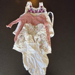Ett set med barnkläder. Inkluderar en långärmad tröja med prickar och matchande byxor, en ljusgrå långärmad tröja, en beige tunika med detaljer och en rosa- och beigefärgad långärmad tröja med ett mönster och ett armbågspatch.
