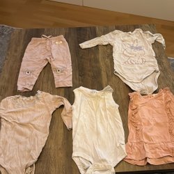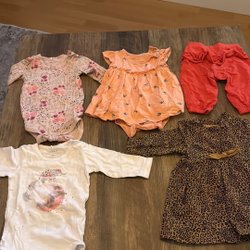 Ett sött set med babykläder. Inkluderar en overall med huva, en sparkdräkt med kattmotiv, ett par leggings, en kofta, en body och en haklapp.