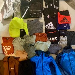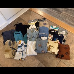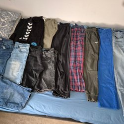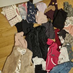 Ett stort klädpaket med blandade kläder. Innehåller tröjor, byxor, pyjamas och mer. Färgerna varierar från rosa och rött till brunt och grått, med olika mönster som rutor och djurtryck.