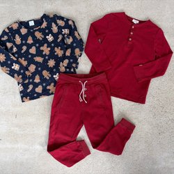 Ett litet klädpaket med en sweatshirt, en långärmad tunn tröja och ett par utsvängda byxor.