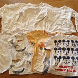 Ett paket med sex tröjor i olika färger och modeller. Inkluderar både kortärmade och långärmade varianter med olika mönster och detaljer. Förekommer ett litet hål på den gula tröjan.
