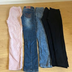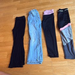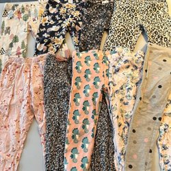 Ett set med fyra leggings för barn. Inkluderar ett par rosa leggings med enhörningsmotiv, ett par ljusrosa leggings, ett par beige leggings med kattmotiv och ett par rosa fluffiga byxor med borttvättade stjärntyck.