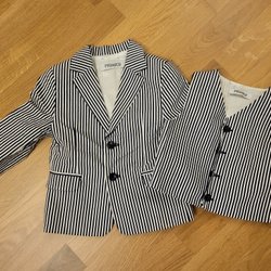 Ett set med barnkläder bestående av en vit långärmad tröja med tryck, en senapsgul cardigan med knappar, en grå och marinblå randig tröja med knappar vid halsen, ett par grå jeans och ett par rutiga shorts.