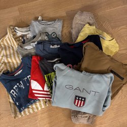 Detta är ett klädpaket med olika barnkläder. Paketet innehåller en långärmad tröja med ett lama-mönster, en mörkblå tröja, en grön långärmad tröja med ett lejonmotiv, en rödbrun t-shirt samt en grön fleecejacka.