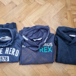 Här är ett set med fyra tröjor. En grön tröja med dinosauriemönster, en mörkblå tröja, en ljusgrå tröja och en ljusgrå tröja med tryck.