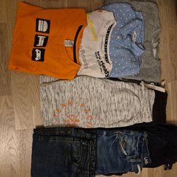 Ett paket med barnkläder. Innehåller tröjor med tryck som AC/DC, Batman och Superman. Det finns även randiga bodys, en kofta med båtar och ankare, byxor i manchester och jeans, samt en Superman-pyjamas.
