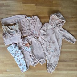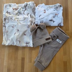 Detta är ett set med tre bodys och två byxor. Bodysarna har lång ärm och knäpps omlott. En body är vit med prickar, en är vit med kaniner och den tredje är vit med skogsdjur. Byxorna har hög midja. Ett par är blå med en kanin på benet och en kanin på rumpan, det andra paret är bruna med knappar.
