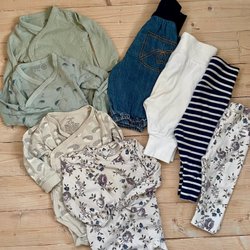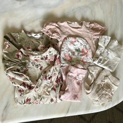 Fint set med en grågrön klänning med volangdetaljer och en vit långärmad body. Dessutom ingår två långärmade bodies och två par byxor i rosa och blommigt.