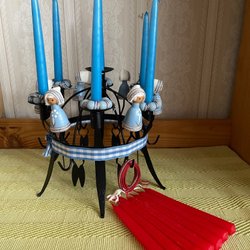 Från vänster - En fin röd tunika el klänning med renhuvud på och volang nertill, en tunika med lussekatter på, en fin lite kraftigare gammaldags klänning med underkjol av bomull och tyll, en fin brun sammetsklänning med huckle till. Skickar med en mössa och ett par knästrumpor ifall de passar i storlek.
