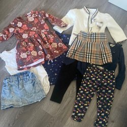 Ett gulligt klädpaket med blandade plagg. Innehåller en ljusgul t-shirt, en lila långärmad tröja med blommor, en vit långärmad blus med jordgubbar och en med blommor, ett par bruna byxor, ett par leggings med blommor, ett par jeansshorts med spets och en jeansklänning.