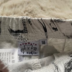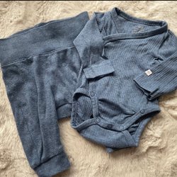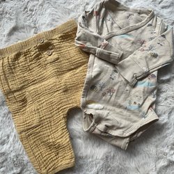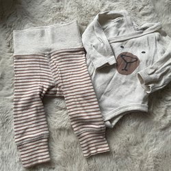 Ett set med en vit body med omlottknäppning och en randig byxa. Båda plaggen är i storlek 50.