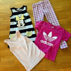 Ok beg skick till mycket gott använt skick. Fyra långärmade, de två översta ok använt skick. De två nedersta gott använt skick. Två t-shirts varav LoL ok använt skick, vita gott använt skick. Fyra byxor varav de med fjäril ok använt skick, de tre andra knappt använda. En klänning använd två ggr. Mest Lindex och Hm.