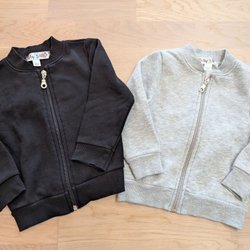 Ett set med en tröja med valar, ett par matchande byxor och en grå tröja med knappar.