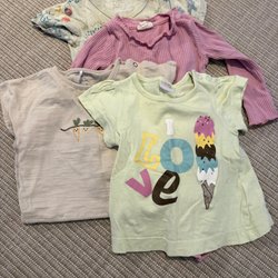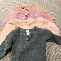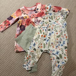 Ett fint set med babykläder. Innehåller en vit kofta med knappar, en rosa blus, en vit byxa med spetsdetaljer, en vit klänning med blommor och en rosa klänning med blommor.