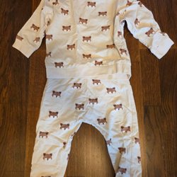 Detta är ett klädpaket med barnkläder. Det inkluderar en beige sparkdräkt med lejonkungen-tryck och en gråsvart långärmad tröja med ett Lejonkungen-märke på ärmen. Det finns också en brun Tom och Jerry-set med tröja och byxor, ett par gröna byxor med lejonkungen-tryck och en vit långärmad tröja med skogsmotiv. Slutligen ingår ett set med tröja och byxor med julmotiv.