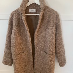 Ett set med tre överdelar. En grön fleece tröja med dragkedja och huva, en vit långärmad tröja och en randig långärmad tröja. Hela och rena.