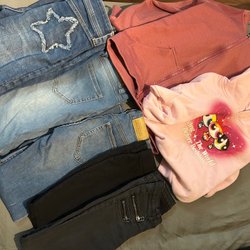 Ett klädpaket med blandade plagg. Innehåller bland annat en lila teddyjacka med öron, en leopardmönstrad tröja, en rosa tröja med skelettmotiv, en svart jumpsuit, en rosa hoodie, en lila och svart klänning, en rosa tröja med stjärnor och ett par turkosa strumpor.