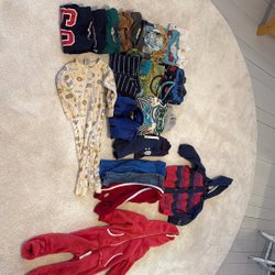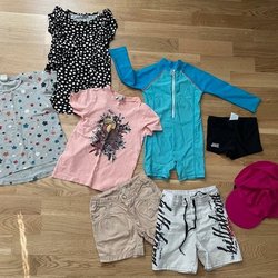 1 st onepice, 4 det T-shirt, med bla Moomin och Bamse, dock en fläck på den, se bild. 1 st regnjacka i använt skick, 1 fleece tröja, 1 fleece byxa, 4 st byxor, 2 långkalsonger/ pyjamas byxor.