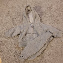 Detta är ett set med babykläder. Setet innehåller en vit body med stjärnor, en randig body med en figur på, en grå tröja och en grårandig pyjamas med dragkedja.