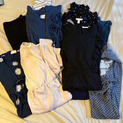 Ett set med babykläder i olika färger. Setet innehåller en rosa kofta (Newbie), en randig mössa (PoP), två par byxor (PoP, Newbie) och ett par strumpbyxor (Newbie).