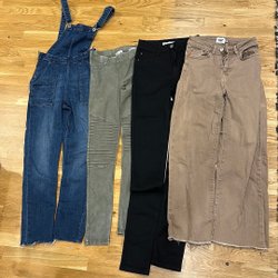 Paketet innehåller en rosa tröja med lång ärm, ett par beige träningsbyxor, ett par svarta träningsbyxor, ett par träningsbyxor med tryck och ett par rosa capribyxor. Ett par skinni jeans. Kan finnas någon fläck.