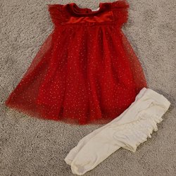 Ett set med en rosa klänning med stjärnor, en rosa body och ett par vita strumpbyxor.