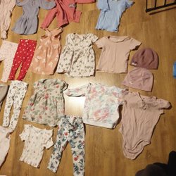 Ett set med barnkläder i strl 74-80. Innehåller en Nike t-shirt, en ljusblå jumpsuit med spetsdetaljer, en vit långärmad tröja, en färgglad body med träd och djurmotiv samt ett par rosa byxor.