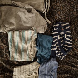 Detta är ett klädpaket med blandade barnkläder. I paketet finns t-shirts, jumpsuit, långärmad tröja 1 par kalsonger, 1 par byxor.