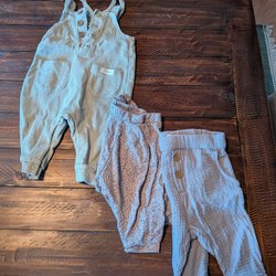 Ett set med babykläder, inklusive en tröja med knappar, två par byxor (ett med fötter), en haklapp och en mössa. Kläderna är vita med ett mönster av blå och orange figurer.